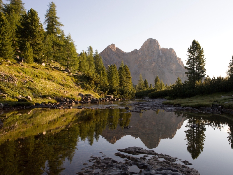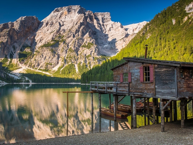 Na een nacht tussen een ouderwets zwaar donzen dekbed ben ik al vroeg uit de veren. Vanaf het balkon van mijn hotelletje zie ik hoe de eerste zonnestralen over de bergkam heenkomen en de dorpskerk aanstralen. Dat belooft veel goeds voor de komende dagen op één van de mooiste Alta Via’s van Italië. Hannes is minder optimistisch, hij heeft het lokale weerbericht gezien: “Het is goed dat we zo vroeg zijn, want rond het middaguur gaat het onweren” Ik zie geen wolkje aan de lucht als we even later uitkijken over het turkooizen water van de Pragser Wildsee. Spiegelend in het fotogenieke meer vormt de Seekofel, met zijn 2.810 meter hoogte, het enige obstakel tussen ons en de lunch.