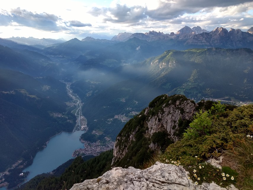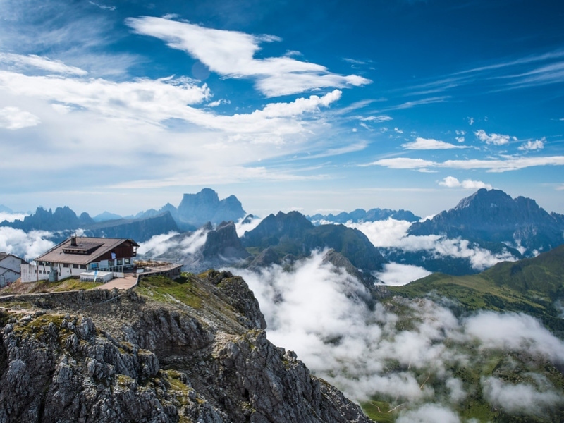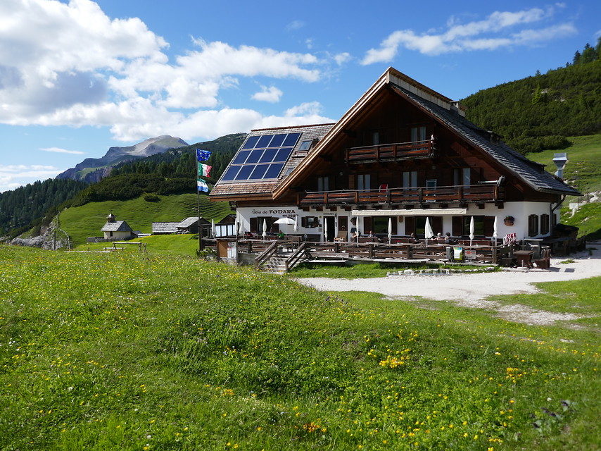 De hele nacht heeft het gespookt rondom de hut. Om 7 uur hield het eindelijk op te regenen. Het gras op de hoogalm is doorweekt en de alpenroosjes staan er een beetje verzopen bij. We dalen tussen twee wolkenlagen af richting het dal. Tegen de tijd dat de Fodara Vedlahut in zicht komt, breken ook de eerste zonnestralen door het wolkendek. Bij de eerste hut zit een herder met zijn voeten omhoog door een verrekijker te turen. Met zijn koeien op het droge heeft hij een relaxte ochtend. Hij nodigt ons uit voor een kop koffie, maar Hannes heeft het weerbericht gezien en vertelt hem dat we door moeten naar de Faneshut. “Oh dan heb je nog een behoorlijke klim voor de boeg” antwoordt de herder. “Griass Enkg” roept hij met zwaar accent. “Pfiat I” groeten we terug.