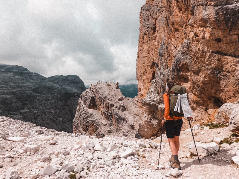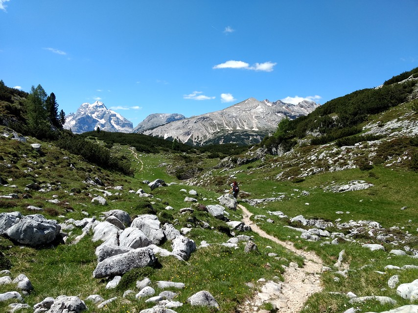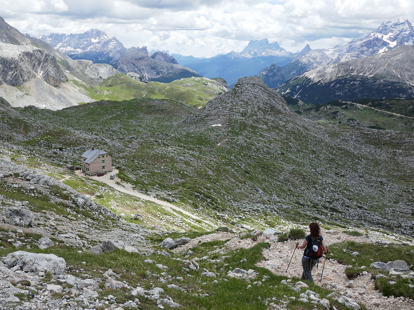 Aan de overkant van het meer slaan we linksaf de puinhelling op. Langzaam zigzaggen we boven het dennenbos uit richting de Porta Sora al Forn, de pas net voor de Seekofelhut. Hannes wijst het Dreizinnenmassief aan dat net tussen de rotsen zichtbaar is. De lucht is inmiddels verre van blauw, en een kwartiertje later slaat de bliksem met een harde klap in op de pas. We schuilen onder een rots terwijl een korte storm ons passeert. Zodra het enigszins droog is haasten we ons snel over de pas richting de veilige hut voor een opwekkende ‘knödelsuppe’. “Aus Holland!” roept de enthousiaste waardin terwijl het dondert tussen de bergen. “Jullie hebben geen bergen, maar wel altijd de beste bergspullen” lacht ze. “Hier! Bitte zwei Radler!”