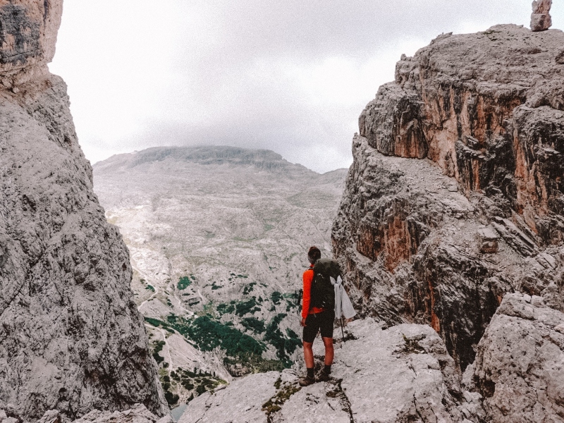 Het stond al een tijdje op de planning in mijn drukke bestaan: wandelen in de Dolomieten. Het is donderdagmiddag als de Ryanairvlucht zijn lading cultuursnuivers en feestbeesten aflevert op het vliegveld van Venetië. Daar sta ik dan, als vreemde eend in de bijt, gewapend met bergschoenen en dagrugzak tussen hoedjes. Buiten staat berggids Hannes me op te wachten. Nog twee uurtjes rijden en dan staan we aan de Pragser Wildsee, beginpunt van de Dolomieten-Höhenweg nummer één, ofwel de Alta Via 1.”