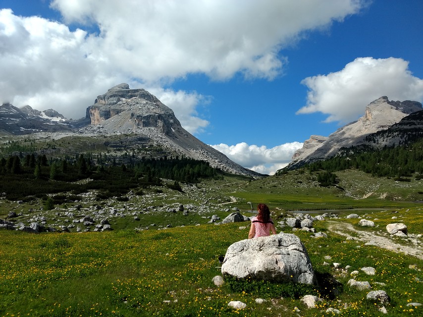 De Dolomieten zijn altijd de tragiek voor mijn knieën en de afdaling naar Rifugio Pederu is meteen een ‘wake-up call’. Over een steile onverharde weg dalen we af naar de gekte van de dagjesmensen die hier in grote getale door het spectaculaire landschap rond banjeren. Vanuit Pederu begint de klim van 520 hoogtemeters. Dit zijn de ‘echte’ Dolomieten. Langzaam voert de Alta Via 1 door Valone de Rudo onder de Eisengabelspitze door naar de Fanesalm. Paradise found! Alpenrozen, meertjes, koeien en Hans en Grietje huisjes omgeven door loodrecht dolomiet. Het zonnetje schijnt barmhartig en in een lichte roes van een halve liter Weizenbier laat ik mijn spieren rusten in het groene gras. Wat wil een mens nog meer?