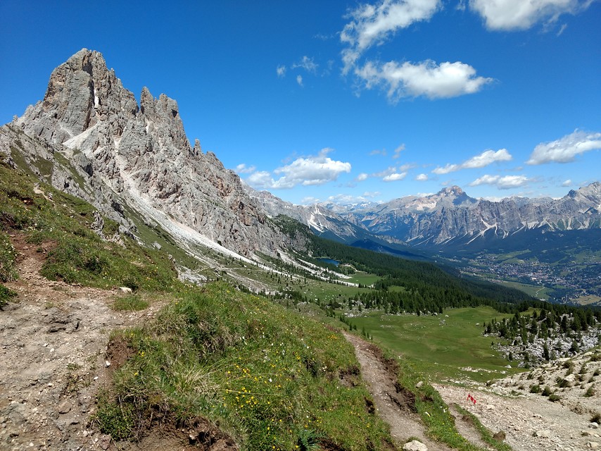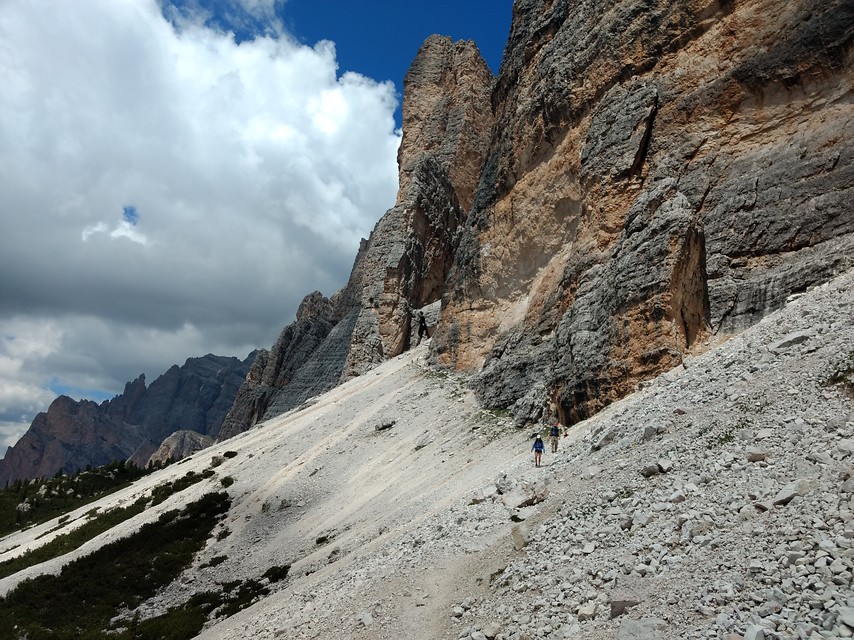 Nog meer zon! En dat op de langste etappe met 1.100 meter stijgen en 400 meter dalen. Het is warm als we vroeg in de ochtend met een groep Amerikanen de hut verlaten. Eerst een stukje omhoog naar het Limojoch, gevolgd door een langzame daling door het Fanesdal. Net als ik denk “Dat gaat lekker”, slaan we af en klimmen richting de Forcella del Lago. Het laatste stukje gaat steil omhoog en mijn brandende kuiten kijken uit naar het moment dat we bij het meertje net onder de pas in het gras gaan liggen. De pas lijkt onbereikbaar. Eenmaal boven zie ik de Amerikanen verward op hun kaart kijken. Waar is dat meertje toch? Ik zie het ook niet, maar als ik een paar stappen afdaal, neem ik in de diepte een blauwgroen rondje waar. Het zal toch niet waar zijn? Nogmaals op de kaart turend, zie ik dat alle hoogtelijnen op elkaar gestapeld zijn. “Hey guys! Willen jullie eerst het goede of het slechte nieuws?” vraag ik de Amerikanen. “Good news: ik zie het meer! Bad news: het is 300 meter loodrecht naar beneden!” Één van de vrouwen kijkt naar haar man met een blik van: “I told you so! We hadden naar Venetië moeten gaan!”. De man zucht en begint aan de afdaling, het is nog net geen via ferrata. Als aanmoediging zien we ook de Lagazuoihut aan de horizon liggen, er ligt slechts een diep dal tussen de hut en ons.
