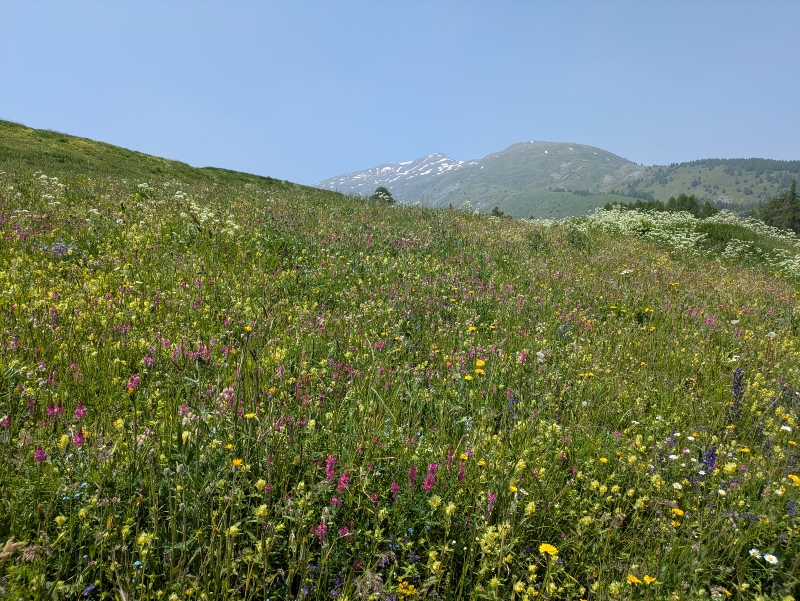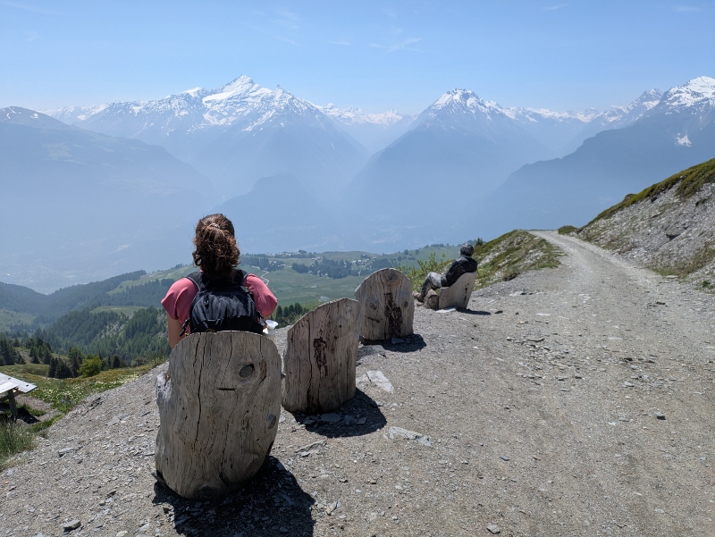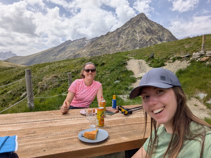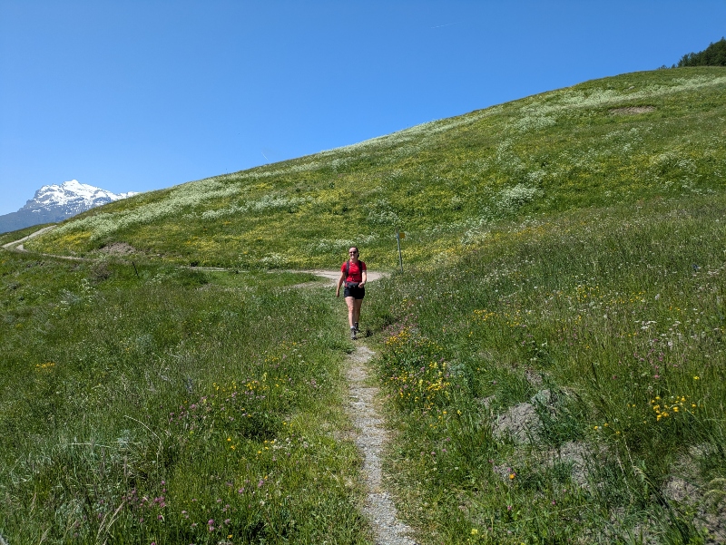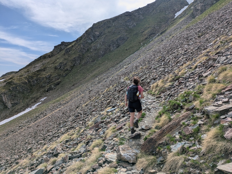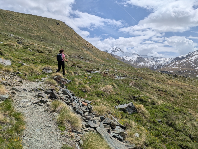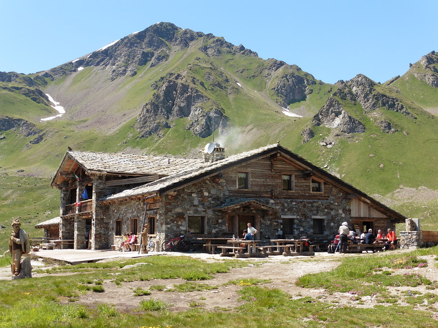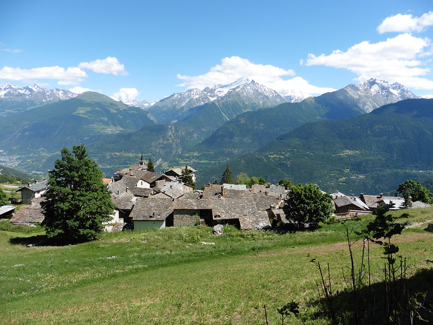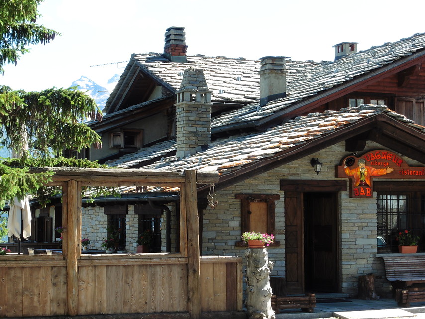 Oeffah, dat valt niet mee. Bij de eerste stap uit het warme bed blijkt het effect van de overwonnen hoogtemeters van de dag ervoor. Stijve spieren en fikse pijn in de benen. Toch weer te enthousiast omhoog gerend. Vandaag gaan we het voorzichtiger aanpakken. Op het programma staat een rondwandeling vanuit het nabijgelegen dorpje Lillaz. Na een eerste steile klim zijn de spieren direct weer alert en opgerekt. De beloning is groot. Boven de boomgrens treffen we een prachtige lunchplek aan het spiegelgladde meer Lago delle Loie op 2354 meter. Het pad slingert over een bergkam met vergezichten naar alle kanten. Het is weer kristalhelder want we zien aan de verre horizon de witte top van het Mont Blanc Massief schitteren.