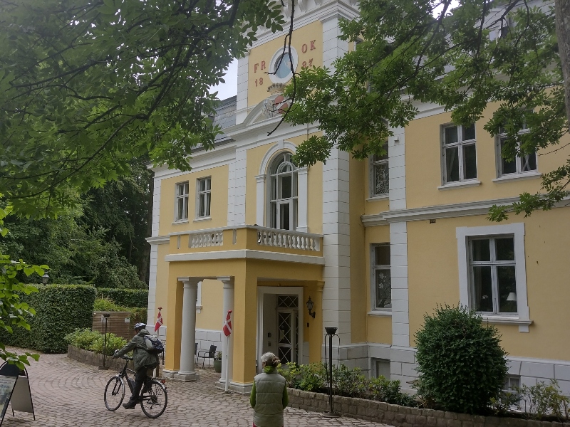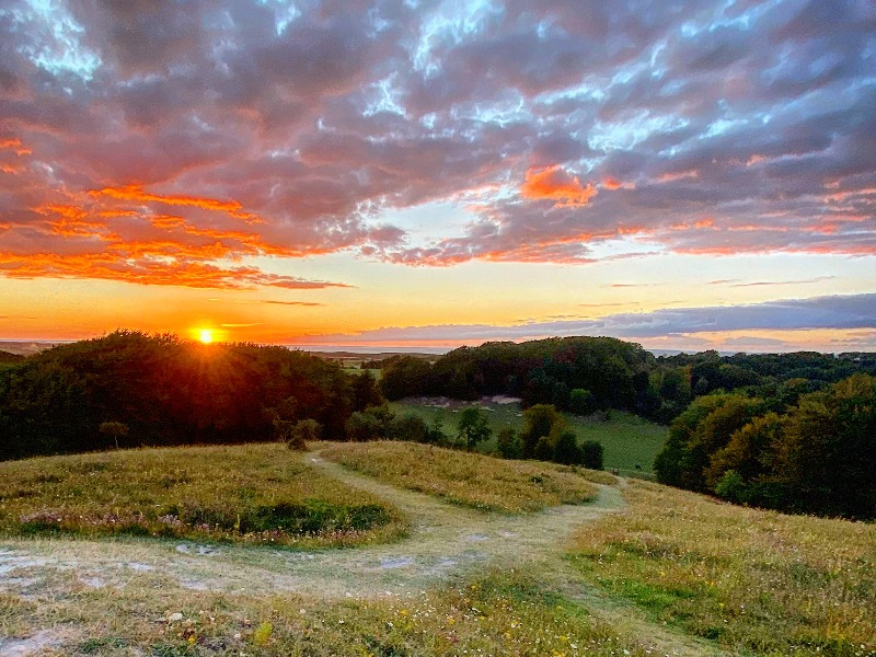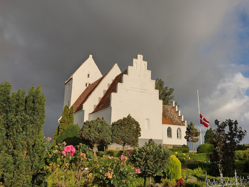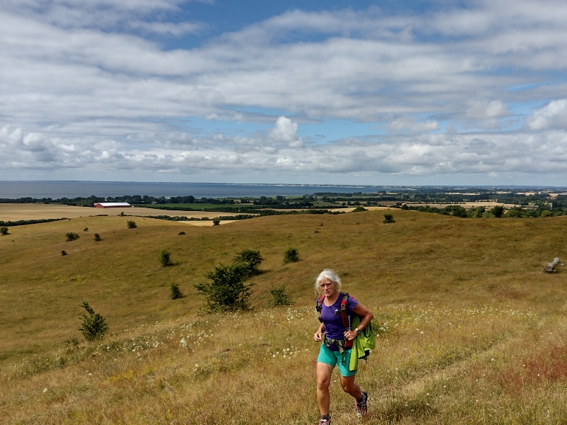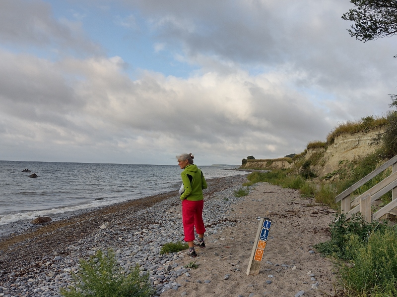 De Camøno Trail gaat verder langs de kustlijn over het strand, terug op het hoofdeiland Møn. Voor het eerst zie ik wat toeristen, die op deze warme dag een frisse duik nemen. Nadat we de kust achter ons hebben gelaten en landinwaarts trekken, torent in verte de witte Elmelunde Kirke boven het landschap uit. De kerk werd voorheen gebruikt als herkenningspunt door handelsschepen op de Baltische Zee. Met haar witte, gladde gevel en rode daken is het een prachtige verschijning. Het is zelfs zo’n oude plek, dat uit de prehistorische bronstijd opgravingen zijn gedaan rond de kerk die vroeger nog van hout was. Nu is hij vrij toegankelijk, en de oude schilderingen op het plafond zijn prachtig. Op nog geen 50 meter van de kerk ligt een gezellig bed and breakfast vanwaar ik de zon achter de kerk zie verdwijnen. Het geeft de witte kerk een rode gloed. Magisch.