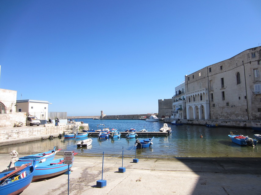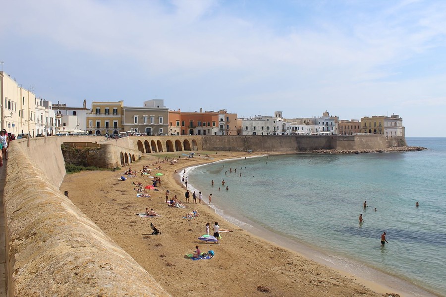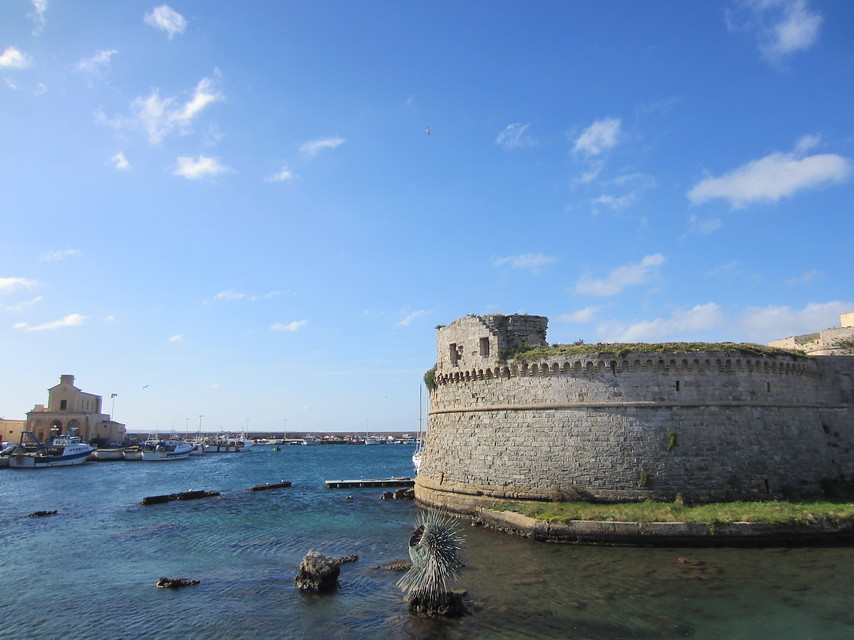 Veertien fijne Salentiaanse kilometers verder pronkt barokdorp Nardò met zijn driehoekige Piazza Salandra. En weer iets verderop schittert er nog veel meer: de − cliché maar waar – azuurblauwe Ionische Zee. Met, tenslotte, in die zee: Gallipoli, historisch schiereilandje en de finishplaats van vandaag. Terwijl ik onze fietskleren was en op het balkon te drogen hang, quote Jelle reisbeschrijving en gids: “Gallipoli = Kalè Polis = mooie stad, gesticht door de Grieken, middeleeuws centrum, baroniale huizen, écht zeldzaam, indrukwekkende catacomben, oudste fontein van Italië, schilderachtige vismarkt...”