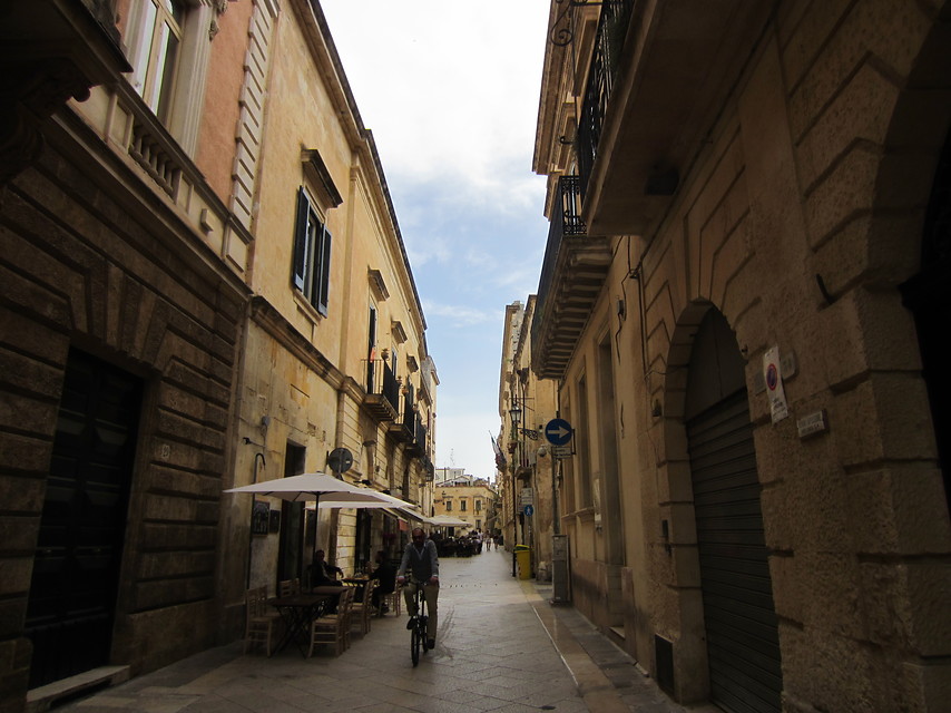 Vanuit Ostuni is het enkel drie kilometer lang dalen om bij het stationnetje uit te komen vanwaar er een trein naar barokstad Lecce tjoekt. Hierover later meer, want wij trappen meteen na aankomst de stad uit. Wederom over een percorso pittoresco. Smalle wegen, kronkelend tussen druivenranken en olijfbomen als Zadkine-sculpturen. Naar Café Castello in Copertino, een klein café pal tegenover het imposante 15e-eeuwse kasteel van − u raadt het al – Copertino. Hier vertelt Lorenzo, een stug rokende grijsaard met twee tanden, ons ongevraagd en ietwat rochelend het googlewaardige verhaal van Jozef van Copertino, een monnik die kon vliegen. “En vrienden, jullie fietsen nu in Salento, de échte Hak van de Laars, als je begrijpt wat ik bedoel.”