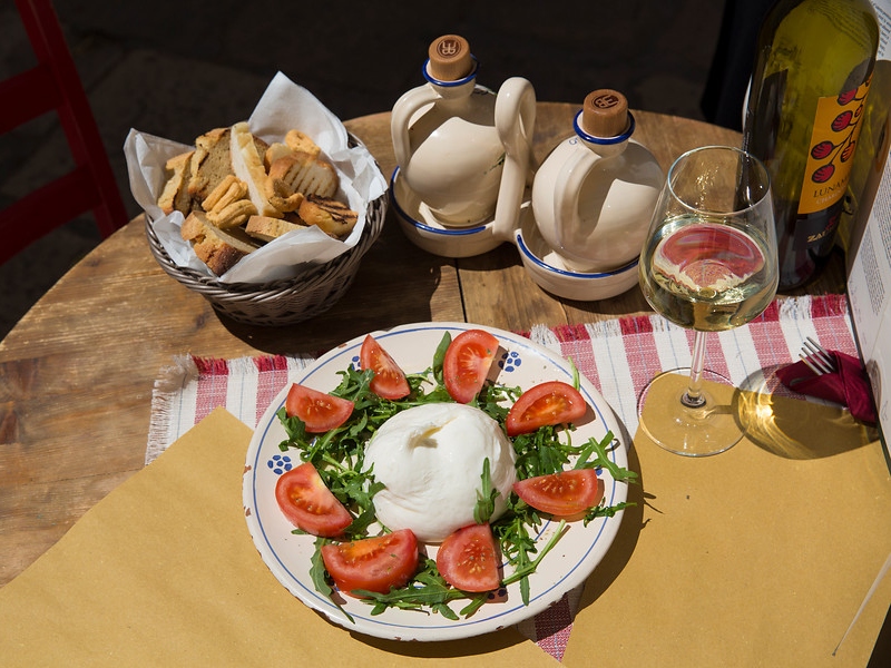 Enfin, wij kopen een fluitje, bekijken de trulli, bestellen een lokaal wijntje op het terras van Caffè Blanco op de Corso Vittorio Emmanuele en gaan dan in La Cantina zitten voor risotto met dagverse frutti di mare die erin gaat als risotto met dagverse frutti di mare.