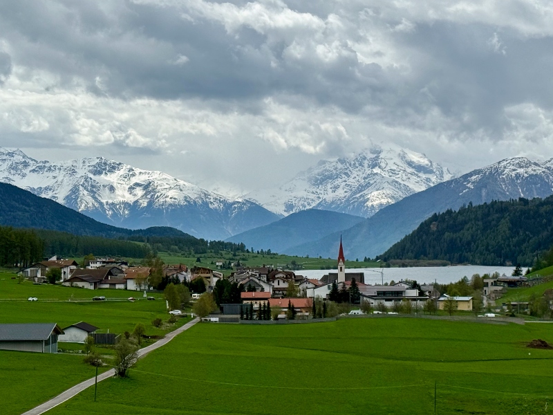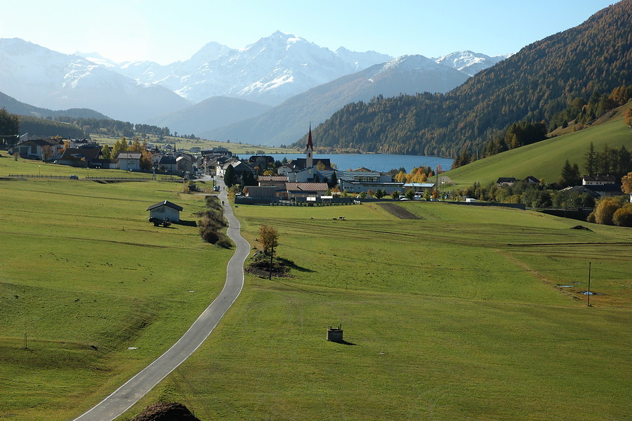 Onder een strakblauwe lucht en met een matig windje in de rug is het fijn fietsen. De Reschensee (of Lago di Resia) glinstert en het turkooizen water steekt mooi af tegen de witte Dolomietenpunten om ons heen. Zo’n zestig jaar geleden werd het dorp Graun verzwolgen door het meer dat ontstond na de bouw van een dam. Het enige dat nog overbleef was de oude kerktoren, die een stuk boven het water uitsteekt. Vandaag staat de ‘kerk in het water’ droog en dat doet wat vreemd aan, het zal wellicht met het seizoen te maken hebben. Ondanks dat het verloop van de Etsch-radweg vanaf hier een dalend karakter heeft, zitten er soms wat pittige korte klimmetjes in. Op een prachtig fietspad gaat het swingend richting de Haidersee, het kleinere broertje van de Reschensee. Ook hier is het smal, bochtig en met tal van stopplekken. Bankjes met vergezichten over de Dolomieten, doorkijkjes op het meer waar de lokale vissers de restaurants bevoorraden.