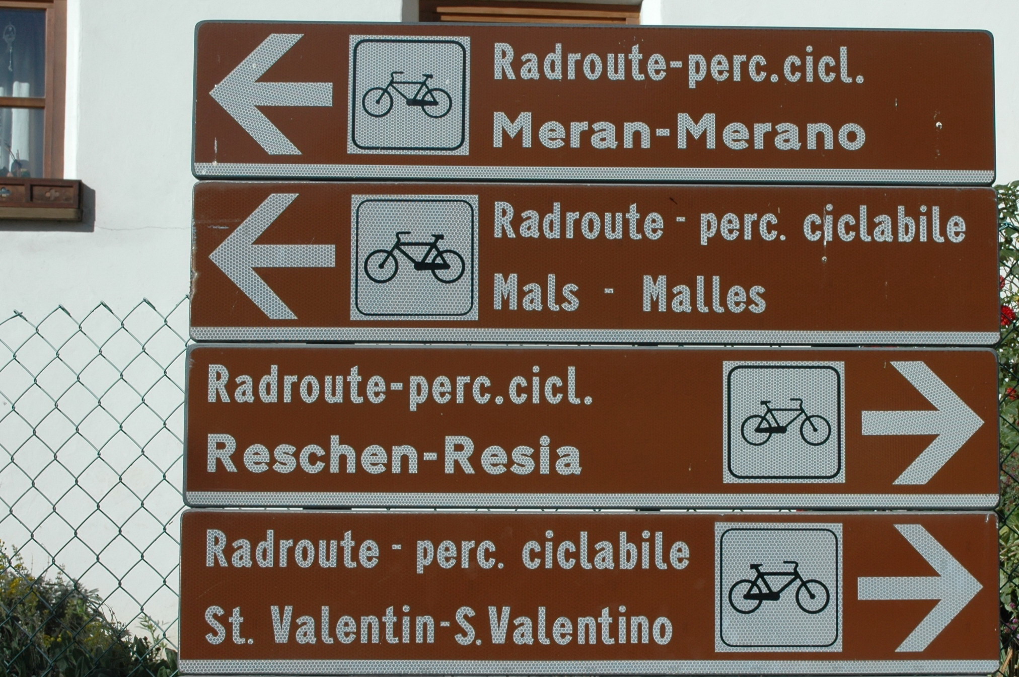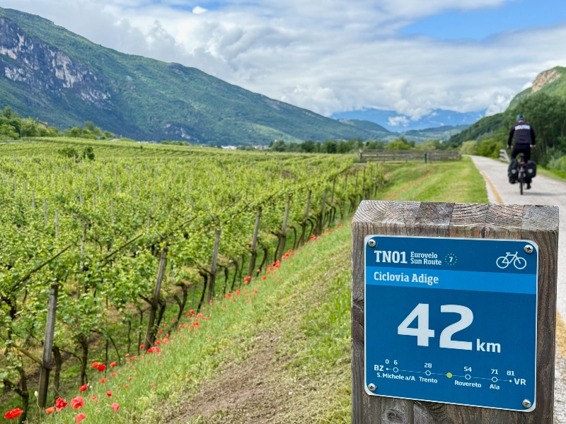“Ciao, Gruezi, Servus, Grussgott” We zijn slechts vijf kilometer onderweg en nog geen enkele groet van de tegenliggers is hetzelfde. Hier in het Noord-Italiaanse Zuid-Tirol fiets ik samen met Sander een stuk van de Etsch-radweg. Deze route loopt grotendeels gelijk aan de Via Claudia Augusta, de bij vakantiefietsers populaire langeafstandsroute. Vanaf de Reschenpas op 1500 meter hoogte gaan we zuidwaarts, het Oostenrijkse Italië in.