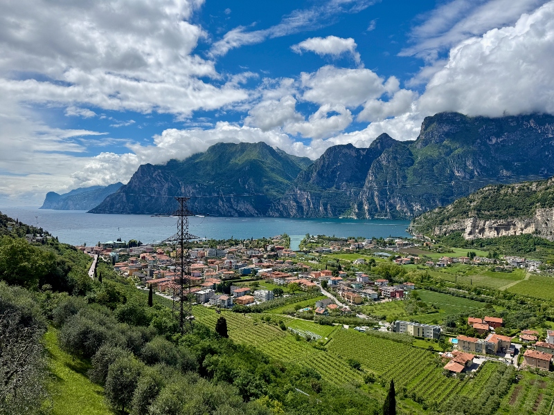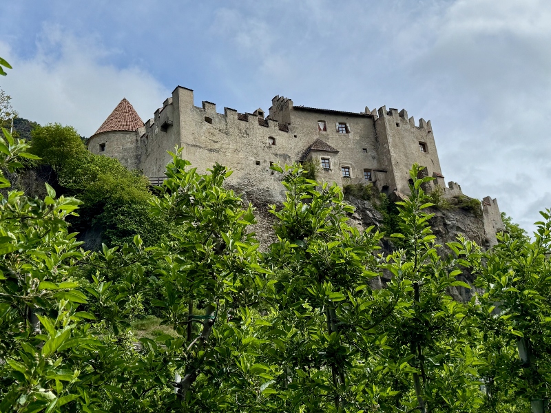 “Zullen we hier een hapje eten?” Een heuse ‘Radbar’ doemt op. Tussen het fietspad en het spoor is het goed toeven. Regionale gerechten en dranken op de kaart, ligstoelen in het gras, alles wat een -inmiddels toch licht vermoeide- fietser nodig heeft. De geur van verse koffie verraadt het Italiaanse, de kaart is overwegend gevuld met specialiteiten uit de regio. De appels zijn uiteraard present en ook de druiven vind je terug in bijvoorbeeld een goede Riesling. Het is lastig om weer op te stappen, deze ‘garden of eden’ voelt als een hele fijne plek. Meran wacht; in de laatste 15 kilometer zijn er nog 400 hoogtemeters te vinden, omlaag dan. Met een stevige wind die vanuit het dal opdoemt is dat niet het beoogde ‘naar beneden zoeven’. Als we het station van Meran bereiken zijn de benen dan ook flink te voelen. De Etsch radweg loopt nog verder, je kunt tot in Verona doortrappen, maar wij houden het hier voor gezien. Bij Papin sport leveren we de fietsen in. “Morgen weer?”