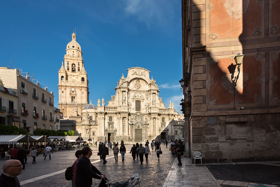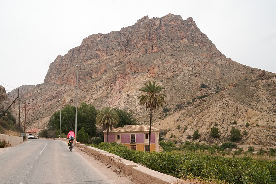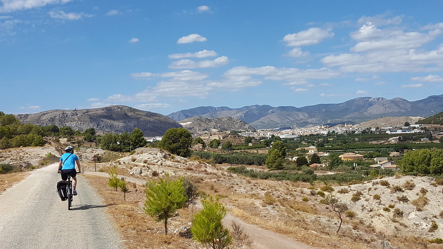 “Als je vanuit Orihuela de Río Segura volgt, 25 kilometer lang over de Camino de Levante, kom je vanzelf in Murcia. Hoofdstad van de regio Murcia. Wat rommeliger dan ‘t Spanje dat achter me lag, maar zeker niet minder leuk. Alleen de stad al, met naast de flamboyante kathedraal een dito Koninklijk Casino (annex museum) plus: barokbeelden, tapasbarretjes & Discos Tráfico, zo’n platenzaak waarvan je het bijna jammer gaat vinden dat je per fiets reist. Enfin, via een muur van rijstebrij − de in beton gegoten rafelranden van Murcia – bereik je hierna de Via Verde del Noroeste, de 80 kilometer lange fietsroute naar Caravaca de la Cruz, een Heilige Stad. Via verkruimelde stationnetjes, roestige viaducten & wreed, kaal onland. Plus: zowel citroenboomgaardbergen als, na het dorp Bullas, schaduwrijk bos. Waarna Caravaca opduikt, stad van een mirakel.”