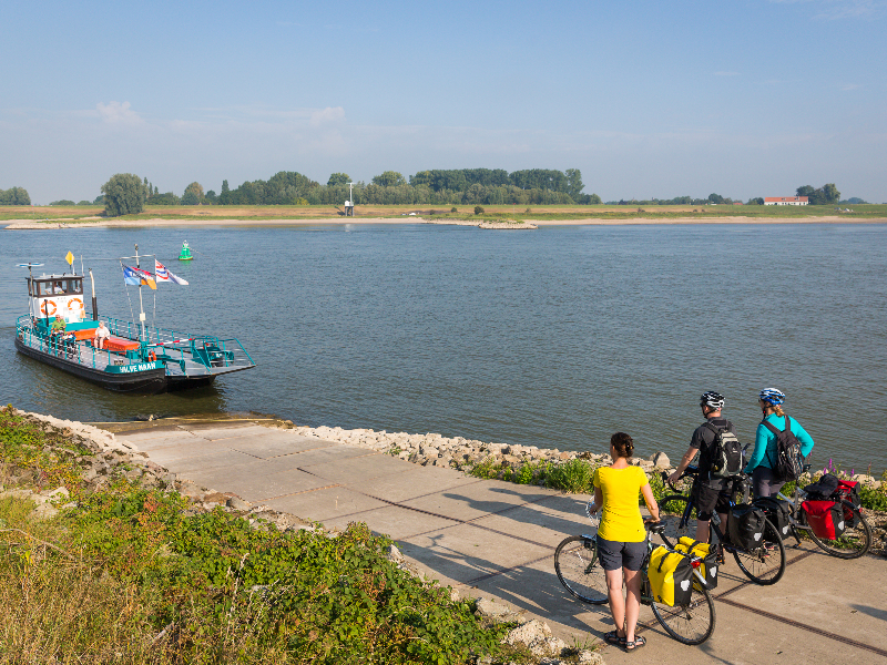 Vanaf Nijmegen glijdt het Fietserpad de Ooijpolder in. Nog even omkijken en dan zie je goed hoe hoog de stuwwal is waarop Nijmegen ligt. De fietsroute slingert langs de waterplassen van natuurgebied De Groenlanden, ontstaan door de kleiwinning. Het dorpje Ooij bestaat uit wat romantische huisjes, dicht langs de dijk. Die komt uit langs Waal waarin kolossale vrachtschepen door het water ploegen. Je kijkt uit over uiterwaarden met kuddes wilde Konikpaarden, dan Natuurgebied De Gelderse Poort met de Millingerwaard. Even voorbij het buitendijkse kerkje van Kekerdom ligt leuk café/B&B De Waard van Kekerdom. Pas bij Millingen aan de Rijn steekt het Fietserpad het Bijlands Kanaal over, maakt een lus om recreatieplas de Bijlandt, en volgt na Tolkamer een kilometerslange brede dijk naar Spijk, de plek waar de Rijn ons land binnenstroomt. Het is onverwacht even klimmen tussen Elten en Stokkum.