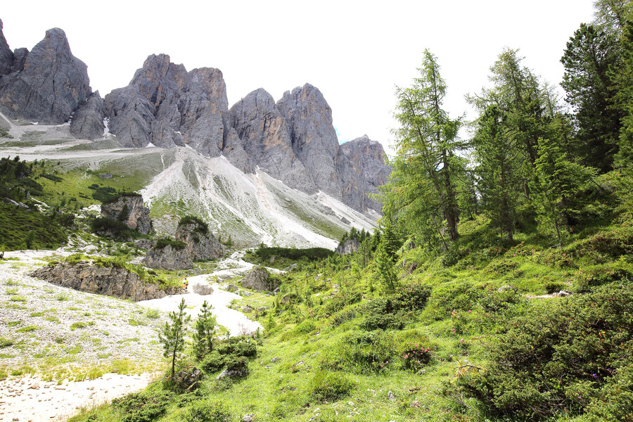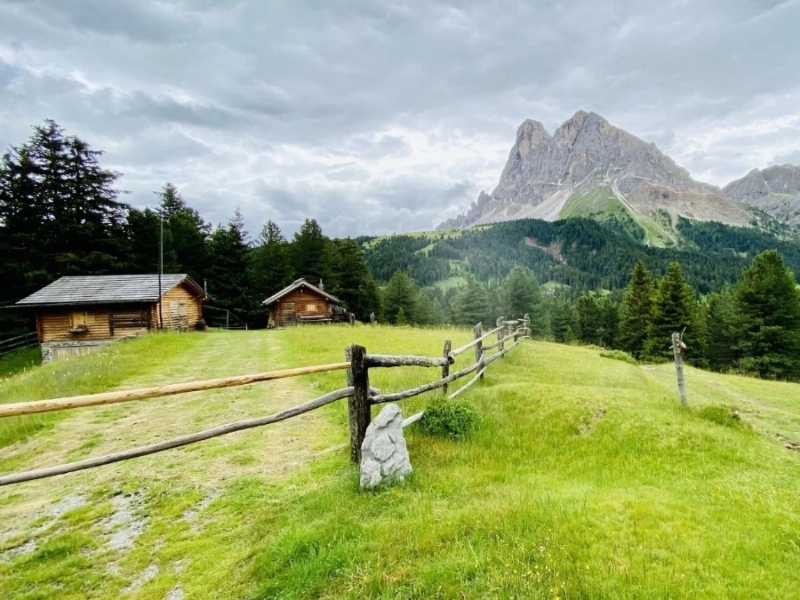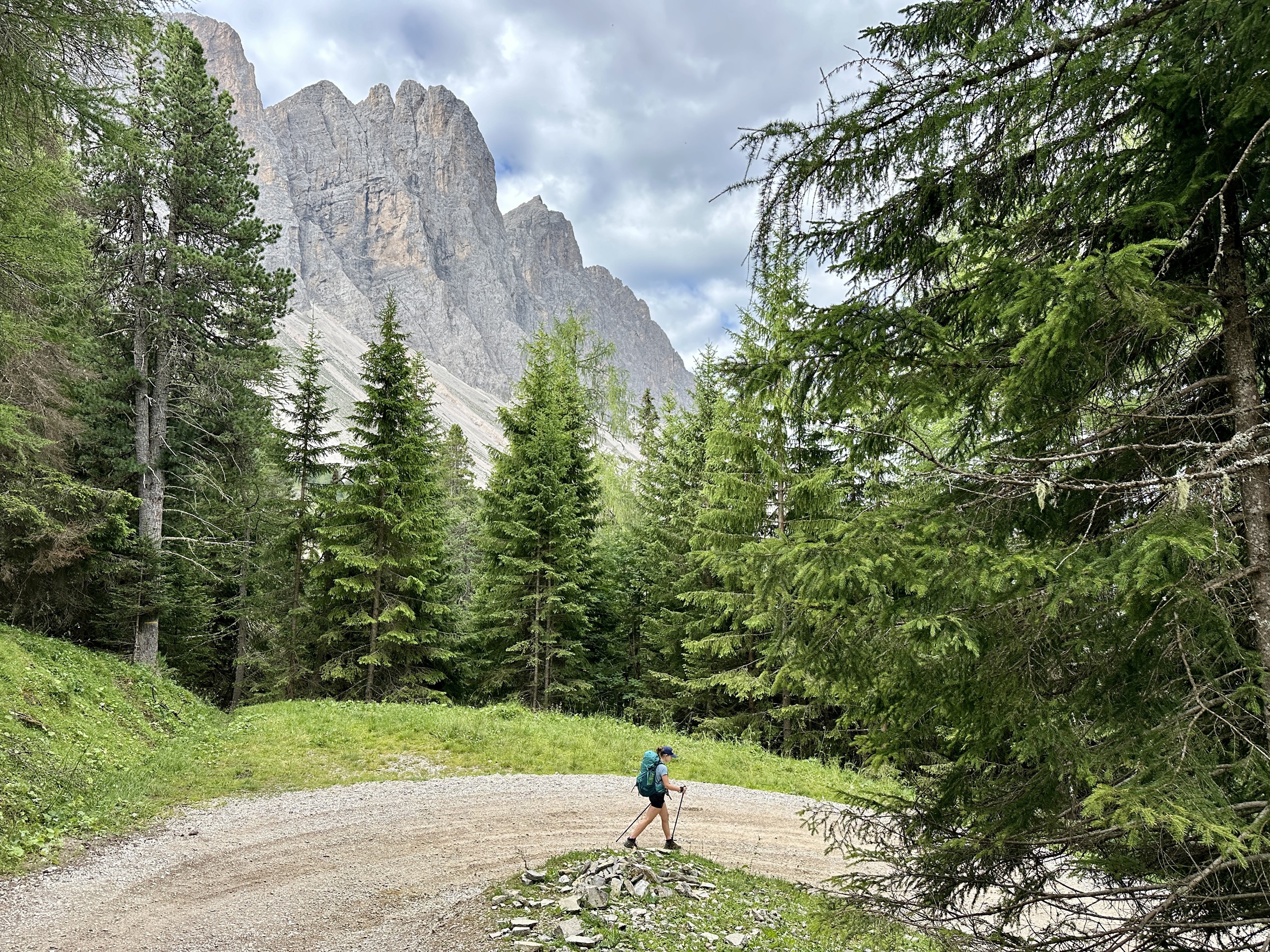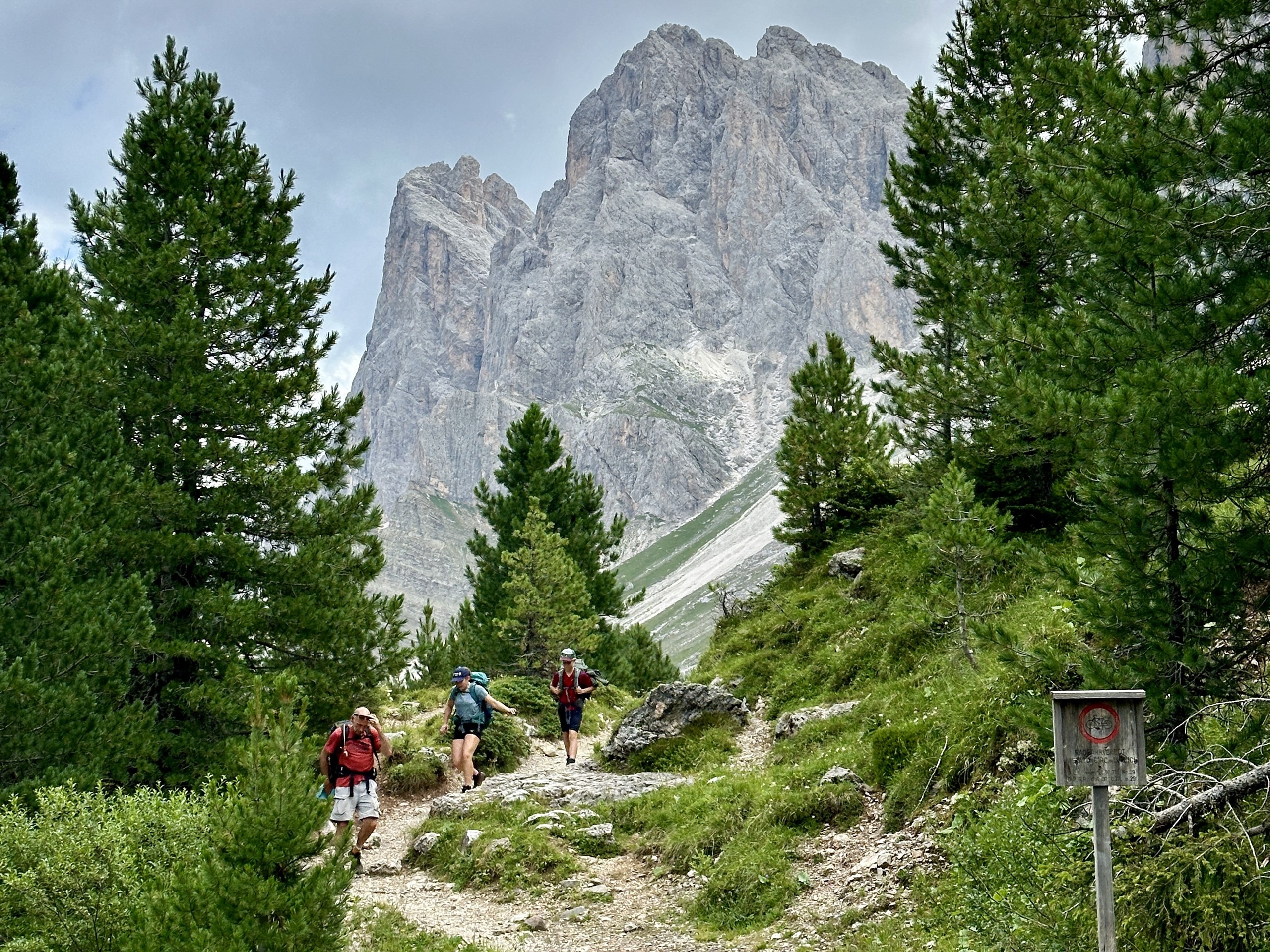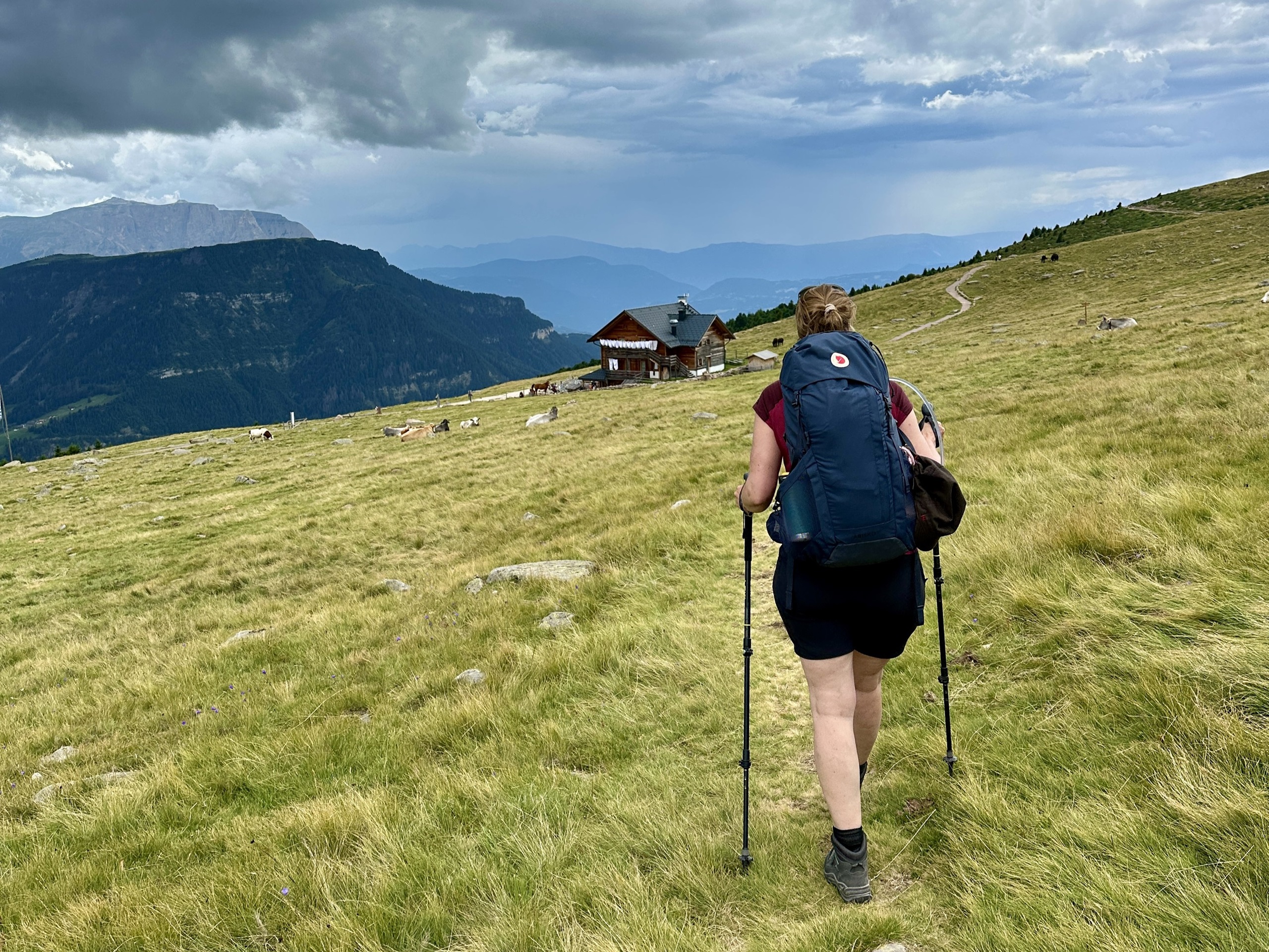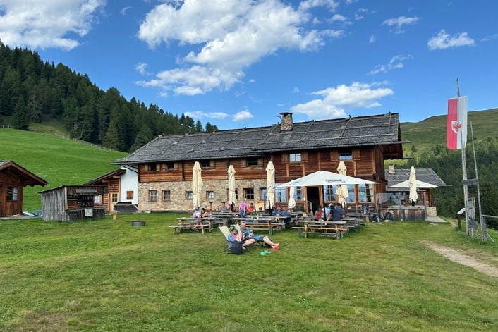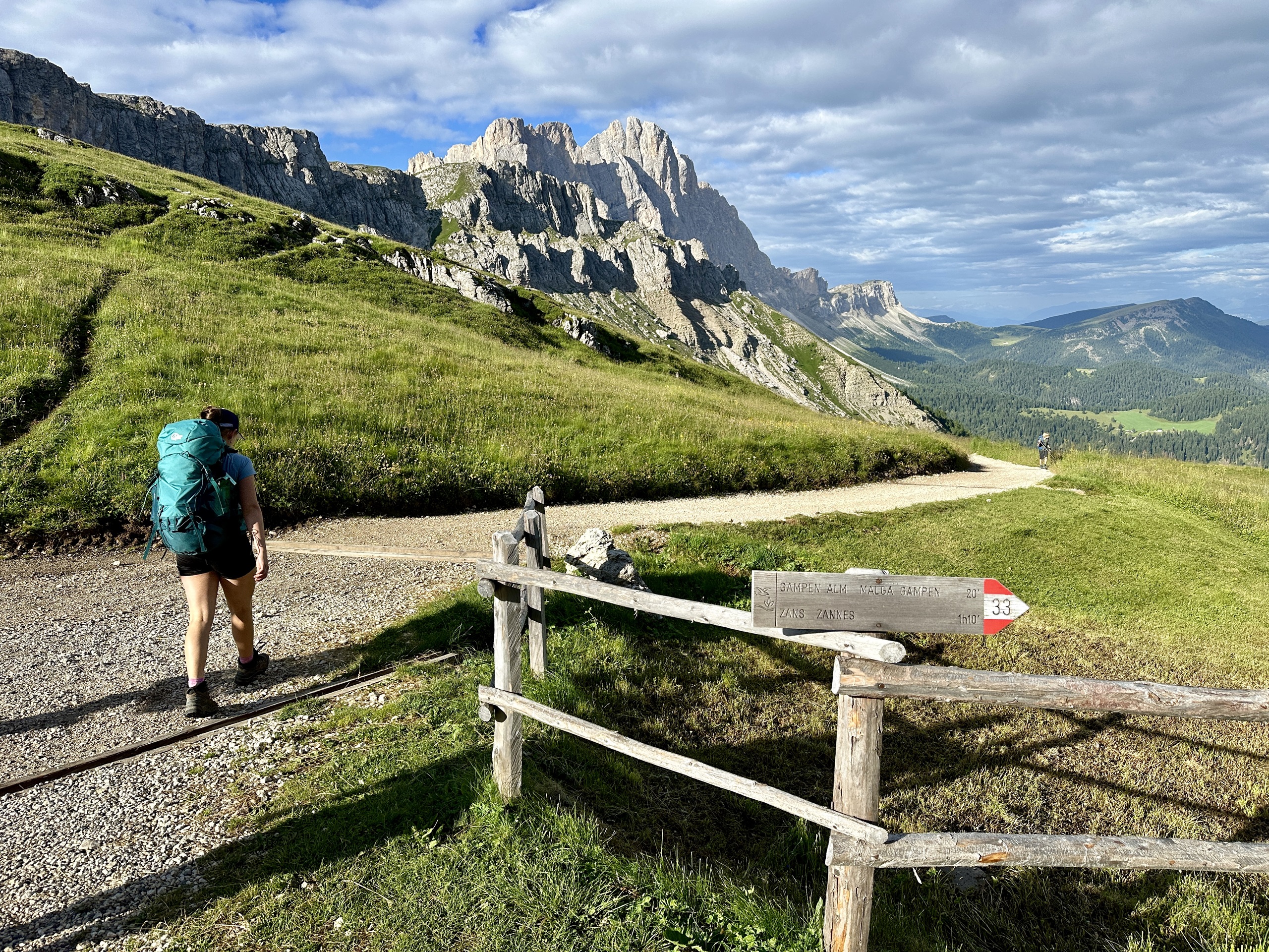 Terug naar het busje. Op weg naar het beginpunt van onze vijfdaagse huttentocht. De spanning is voelbaar als we nog een ander stel ophalen. Hebben we alles? Hoe gaan de kinderen het vinden? Het is voor hen hun eerste huttentocht. Daar is de Doloramaweg, met niet al te veel stijgen en dalen en zonder steile afgronden, de perfecte tocht voor. Voor we het weten, zijn we er. Parkeerplaats Zumis (1700 m), het beginpunt van onze tocht. In de meeste gidsen wordt de Doloramaweg omschreven als een vierdaagse huttentocht. Wij gaan er vijf dagen over doen, over de eerste etappe doen we twee dagen. Dat is het standaard arrangement van SNP, waar wij de reis geboekt hebben. Zo kun je de eerste twee dagen een beetje inlopen. En begin je niet met ruim twintig kilometer wandelen op één dag. Het begin is zoals een begin hoort te zijn. Onwennig. Dubbelchecken of je veters goed zitten. Je rugzak nog een keer afstellen. Maar het is ook nu al genieten. Van Fay en Jip die dapper doorstappen. Allebei een eigen rugzak. Goeie wandelschoenen en één setje wandelstokken. Want daar willen ze afwisselend wel-niet-wel-niet-wel mee lopen. Talloze graspaden en best wat uitzicht op indrukwekkende bergen verder, zijn we ineens in de Kreuzwiesenhütte (1925 m), het eerste overnachtingsadres.