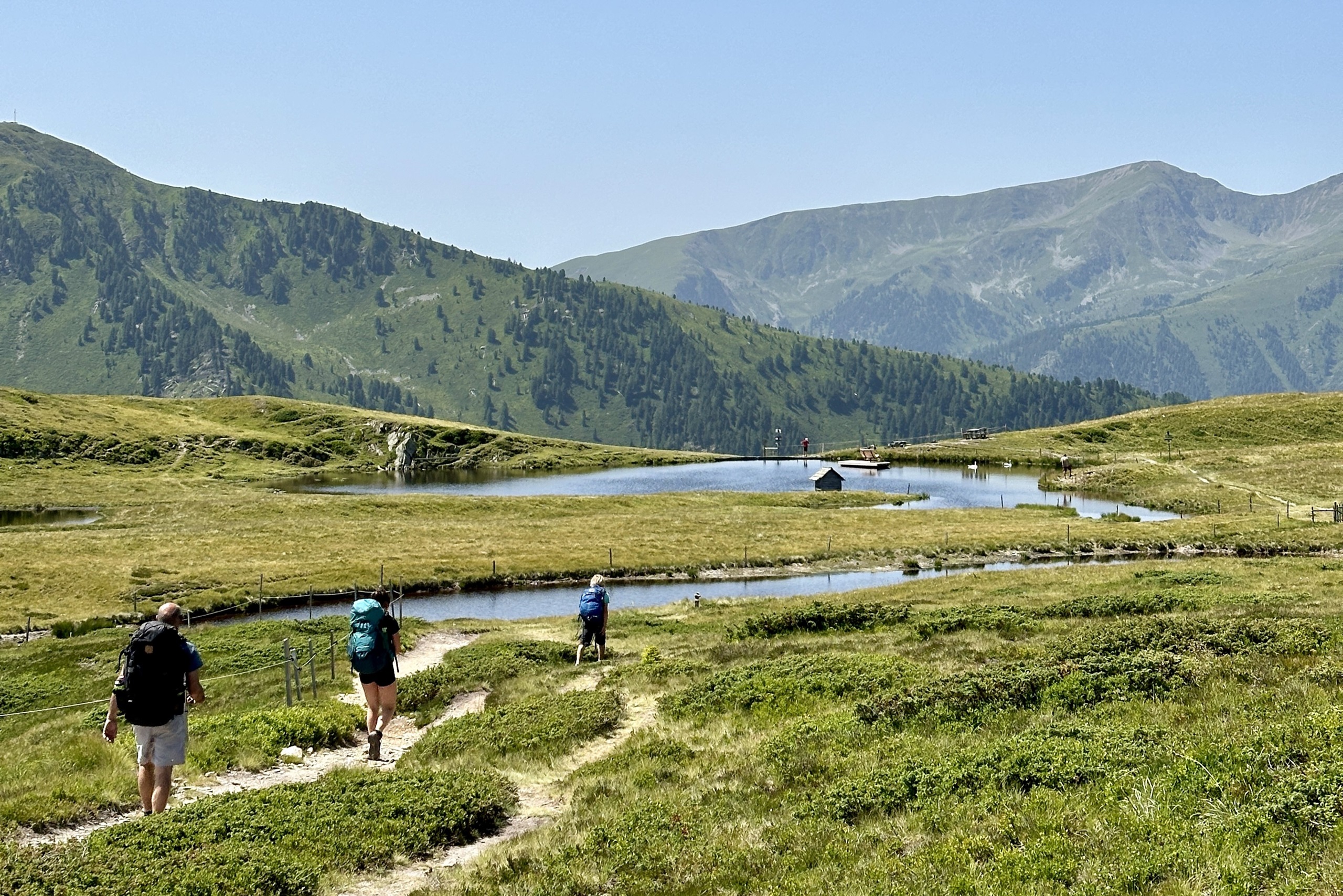 Ook dag twee is prima te doen. De start is even pittig, met een stijging met de zon in ons gezicht. Het is al snel warm. Maar een eerste topkruis waar naar uitgekeken kan worden maakt veel goed. Boven maken we de nodige foto’s. Eten en drinken uitgebreid. We hebben alle tijd, in totaal moeten we vandaag elf kilometer lopen, 550 meter stijgen en 350 meter dalen. Ongeveer halverwege nemen we nóg een lange pauze. Bij de Glittnersee móet gezwommen worden door de kinderen. Al is zwemmen een groot woord. Het water komt tot hun navel. Verderop zwemmen twee zwanen die het geplons argwanend in de gaten houden. Na een tijdje sluit het andere gezin aan. Ook hun kinderen willen écht het water in. Het tweede stuk van dag twee lopen we met z’n achten. Kinderen voorop en zonder ook maar één keer te klagen of te vragen ‘hoe ver nog?’ bereiken we de Maurerhütte. En daar: Wat. Een. Uitzicht.