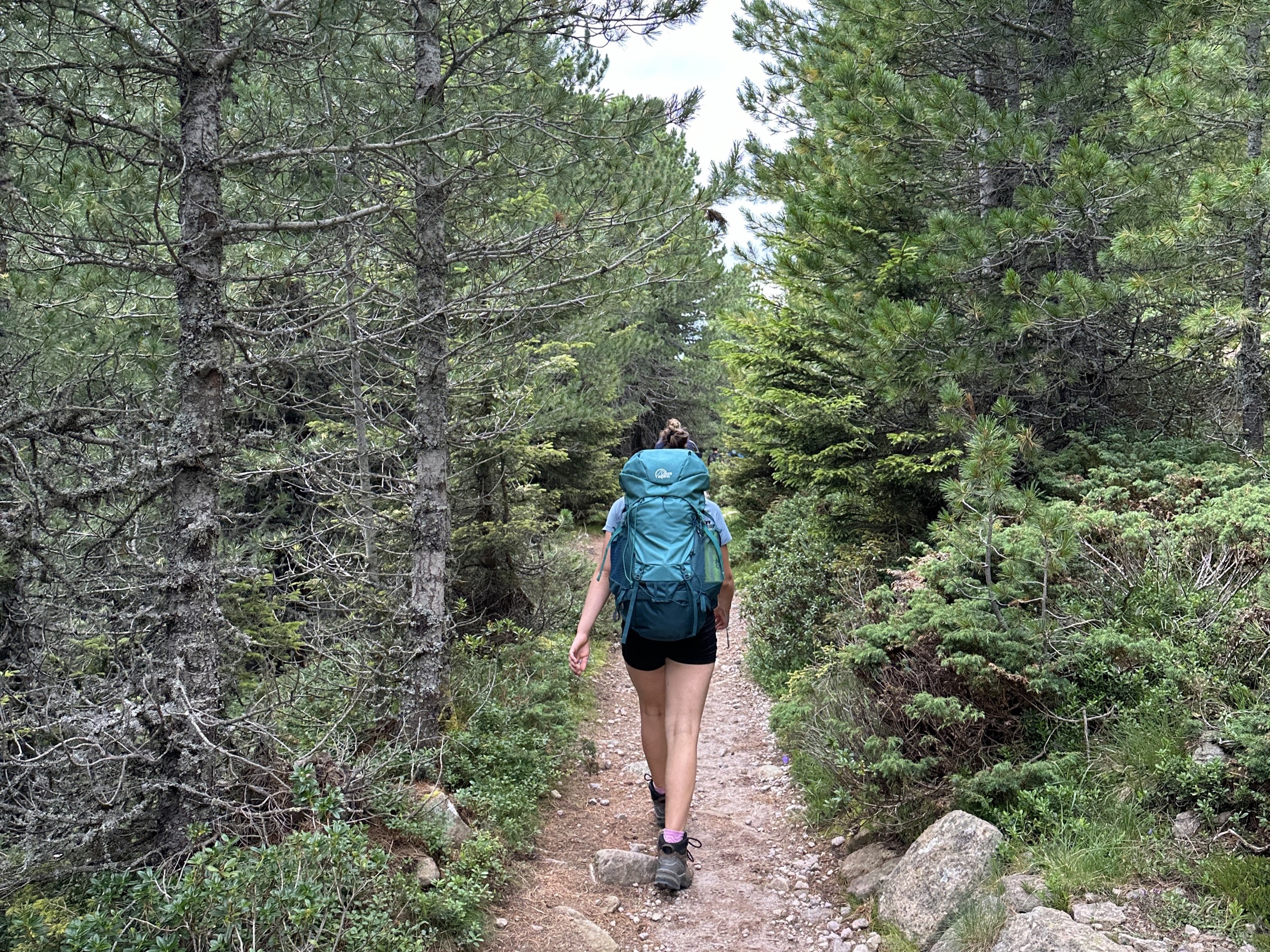 Vandaag staat ons voor het eerst een wat langere dag te wandelen. Helaas zijn alle weerberichten die we checken het eens: aan het einde van de dag is de kans op regen en onweer groot. We besluiten vroeg op te staan en vroeg te vertrekken. Het opnieuw inpakken van de rugzakken: éérst de waterzakken vullen! begint al een beetje routine te worden. De lunchpakketten die we meekrijgen gaan bovenop en net na acht uur zetten we de eerste stappen. We kunnen gelukkig rustig wakker worden. De eerste kilometers gaan over een gemoedelijk slingerende gravelweg, naar beneden. Op het laagste punt komen we de enige asfaltweg van deze reis tegen. Er is een restaurant en een flinke parkeerplaats. Vanaf hier worden we vergezeld door diverse groepjes dagjesmensen. De grijze bergen waar we gisteren op uitkeken zijn ineens al heel dichtbij. We lopen er onderlangs. We slalommen tussen groepjes mensen op teenslippers en sportschoenen door. De kinderen gaan nog nét iets rechter op lopen als ze een Nederlands stel bewonderend horen praten over hun rugzakken. We stoppen voor wat foto’s, al moeten we daar op de mooiste plekken soms heel even voor in de rij staan. Fay en Jip grijpen hun kans om op wat enorme grijze rotsen te klimmen. De lucht is nog strakblauw, toch checken we regelmatig de weerapp. Na een wat vlakker stuk is het weer klimmen geblazen. De drukte neemt gelijk af. Eenmaal boven kunnen we perfect uitleggen wat een bergkam is. Achter ons ligt een bossig stuk, voor ons ontvouwt zich een traditioneel bergpanorama. Glooiend groene weides en waar we ook kijken, bergen. Heel veel bergen. Tijd voor een lunchpauze.