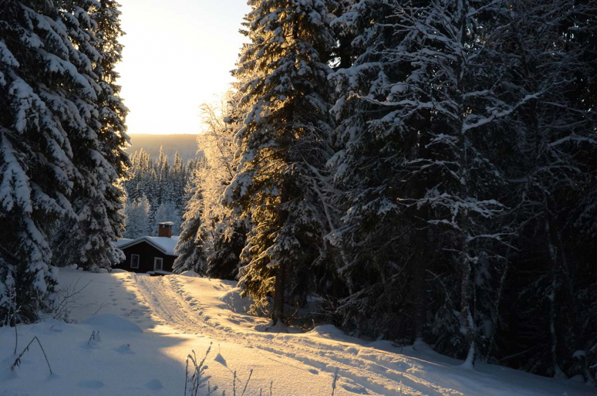 In het enige winkeltje verkopen ze lucifers, ski’s, noodrantsoenen, warme Zweedse wanten en alles wat je maar nodig hebt voor een comfortabel verblijf in de Zweedse sneeuw. Aan het eind van de weg wappert de Zweedse vlag bij Dalens Gård. Einde van de wereld. Maar bij dit eindpunt knappert het berkenhout goed in de open haard. De trap naar boven kraakt, de bloemen staan op de ramen; even helemaal terug in de tijd.