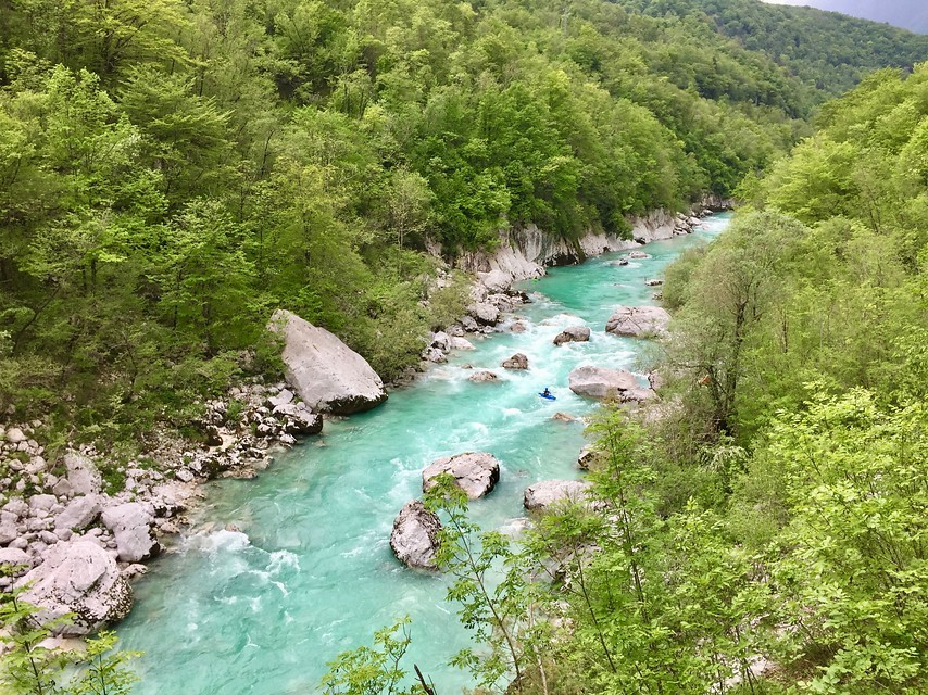 De Soca rivier leidt ons over de smalle trail, Soška-Pot is Sloveense benaming voor de route die iets meer dan twintig kilometer lang is en onderdeel van de langeafstandsroute 'Alpe Adria Trail'. "Kijk dat water!" Je blijft ernaar kijken, de bijzondere kleur groen is typisch voor de Soca rivier. Ze betovert en wanneer je eraan toegeeft en blijft kijken maak je grote kans dat je er zo in duikelt. De trail is smal, over rotsblokken, door dichtbebost gebied, soms steil, maar over het algemeen prima te doen.