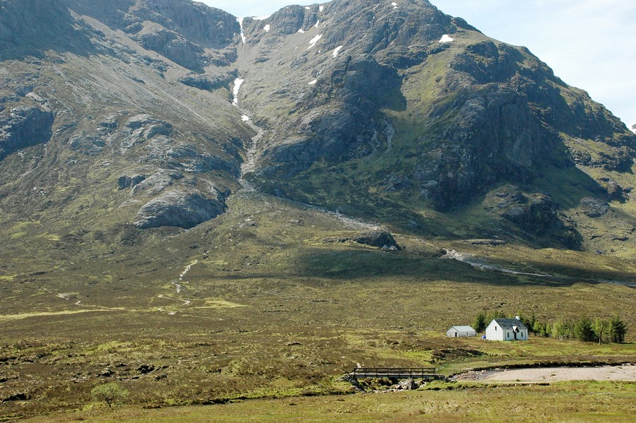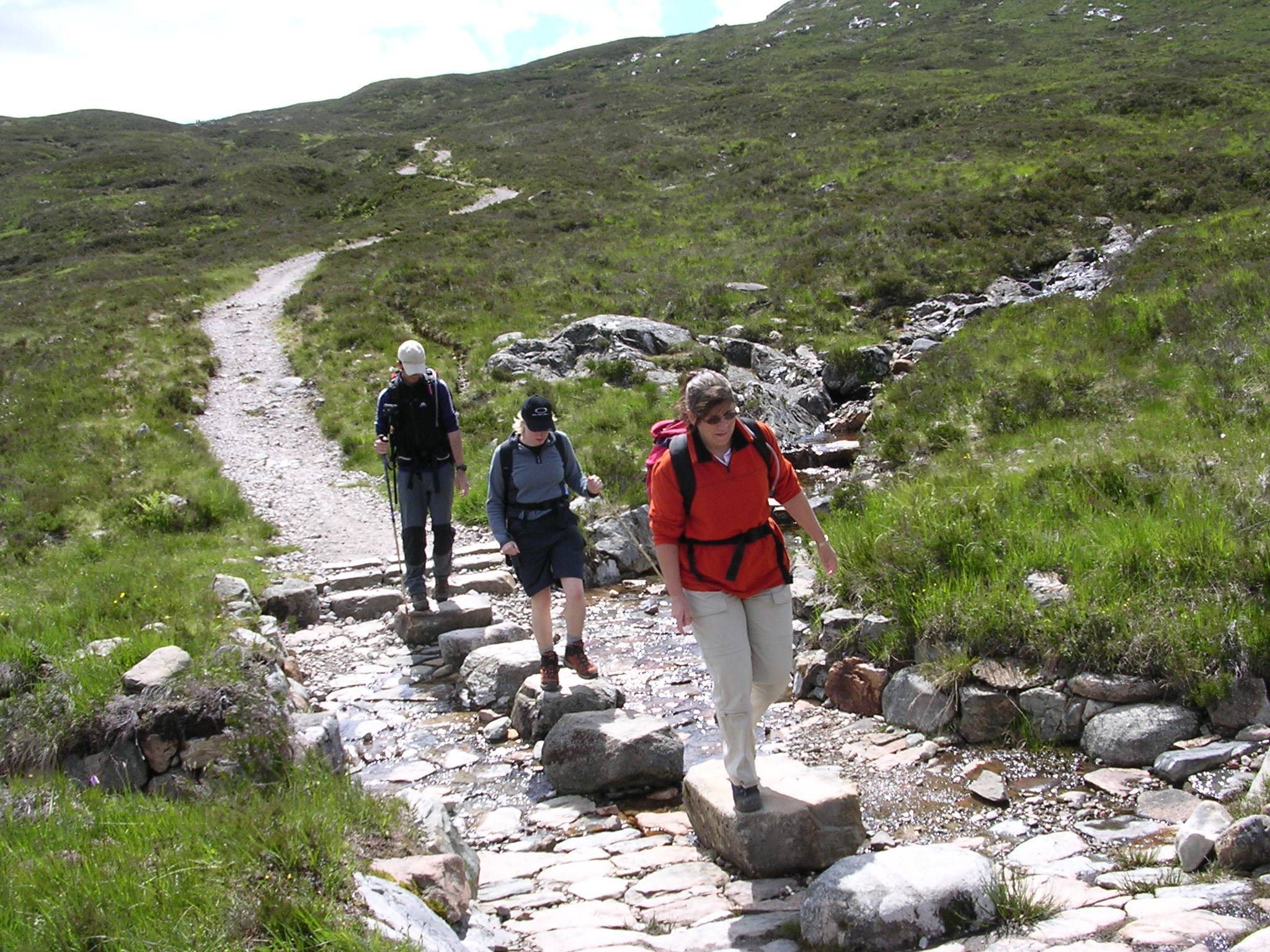 Vanaf de brug wandelen we dieper de Schotse Hooglanden in. Na een paar pittige dagen zijn onze wandelbenen niet meer zo moe maar juist goed getraind en kunnen we meer van de trail genieten. De tocht gaat naar Glencoe met zijn typerende donkerbruine bergen die hoog uittorenen in het heuvellandschap. We naderen de befaamde klim op de Devil’s Staircase. Het pad dankt haar naam aan de militairen die omstreeks 1750 al zigzaggend het pad (staircase) maakten en er zwaar materieel over vervoerden. Daarom werd het pad omgedoopt tot de Devil’s Staircase. Voor wandelaars slechts met een backpack blijkt het wel mee te vallen en al zigzaggend stijgen we naar een plateau met vergezichten op de vele Munros, Schotse bergen die hoger zijn dan 914 meter. We toppen het hoogste punt van de West Highland Way op 548 meter en rusten even uit voordat we afdalen naar onze laatste slaapplek Kinlochleven.